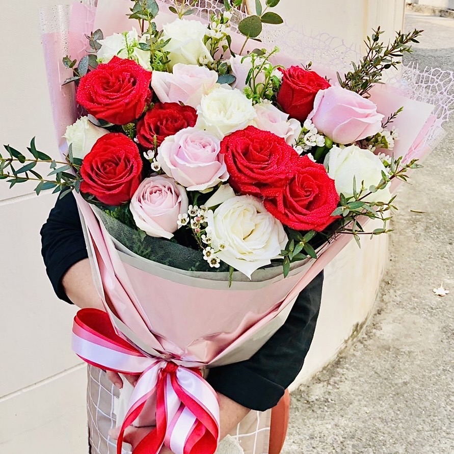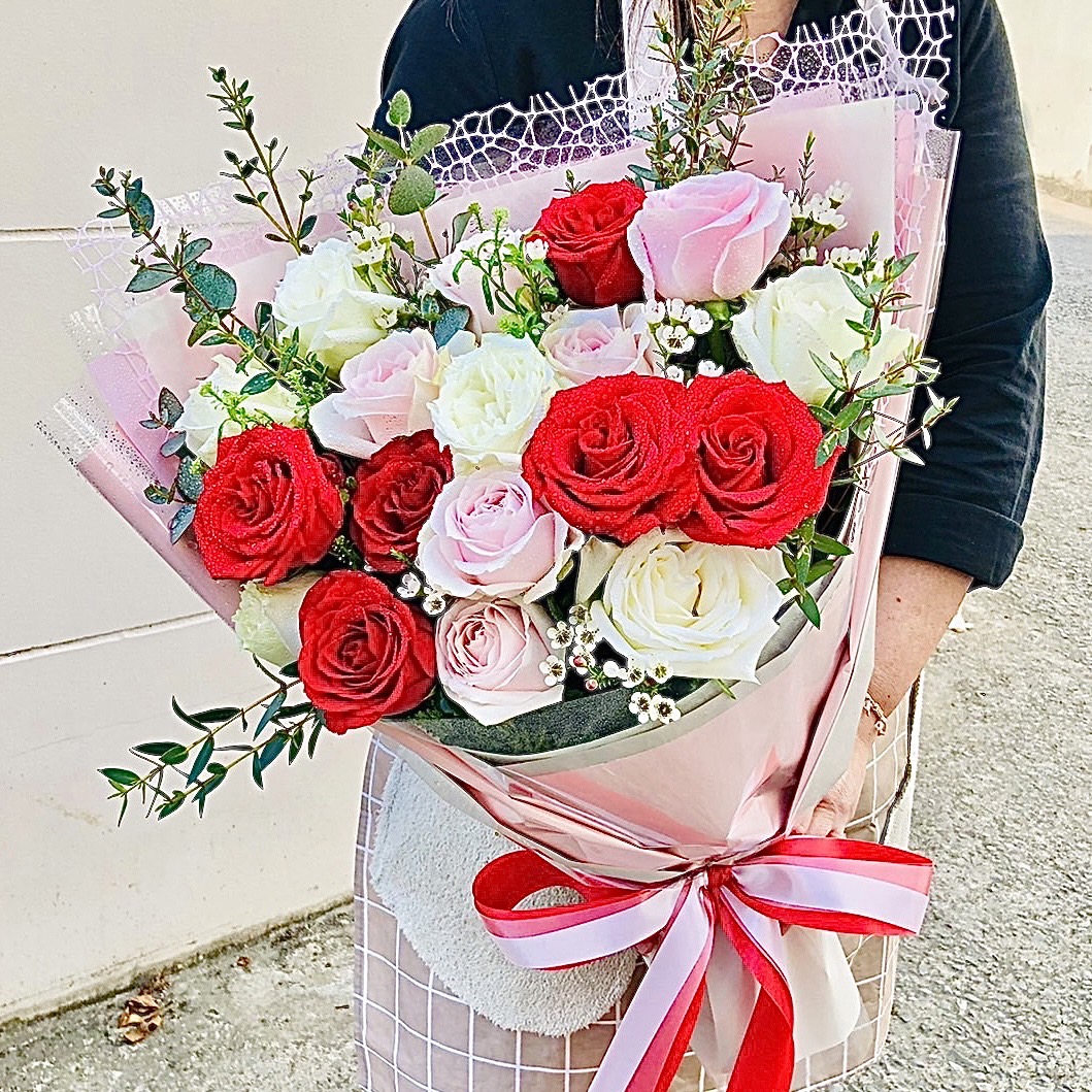 Prepare for festivals of happiness with precious bouquet. A fresh mixed arrangement showcasing 18 mixed color roses. Start a good day with delightful and glamorous flowers.