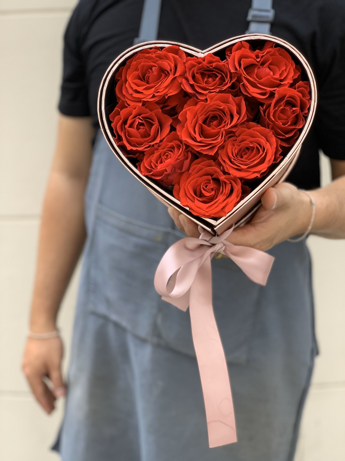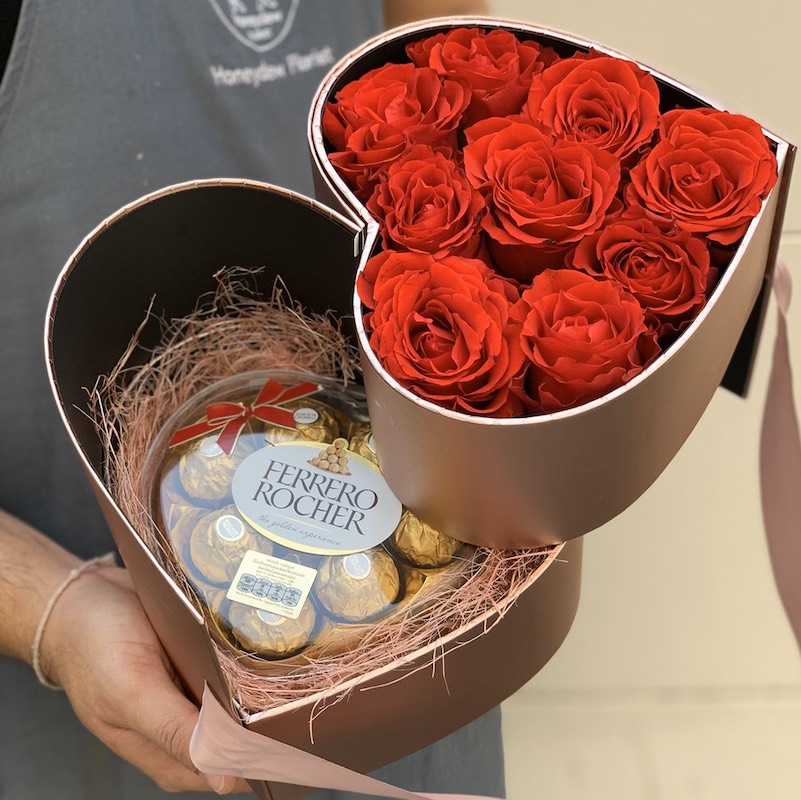 A romantic and charming with 2 layers of heart shape box decorated with the 9 red roses and Ferrero Rocher Chocolate will make your day happier. There are good meanings hidden in this beautiful box such as love, care and thinking of you.
