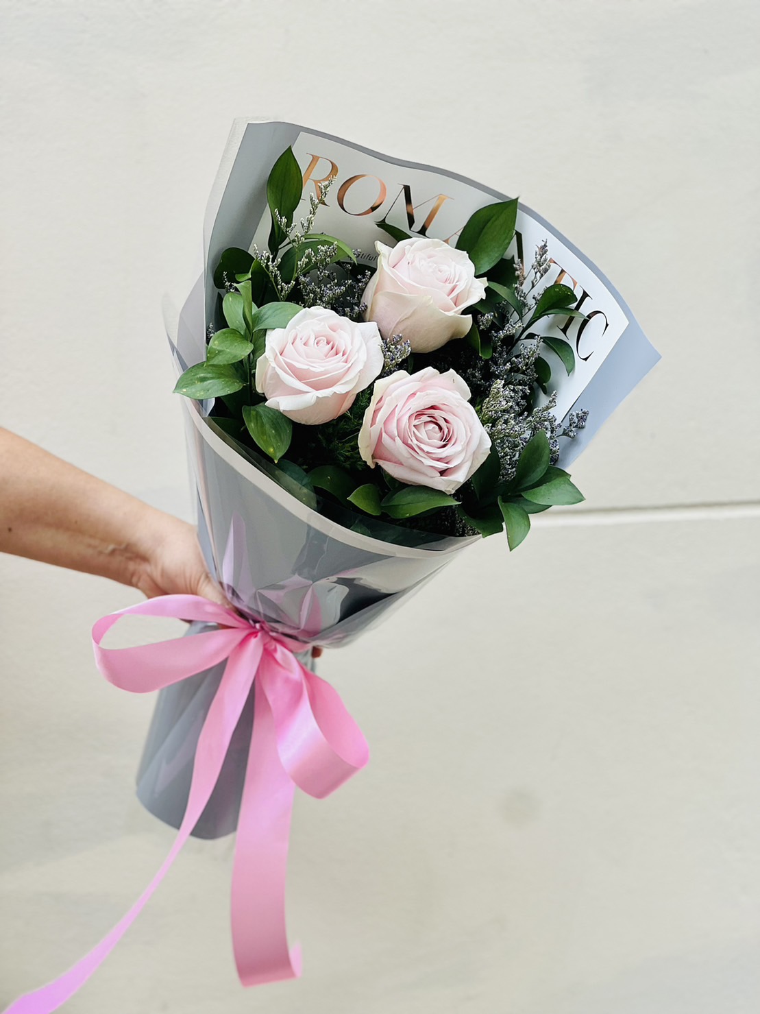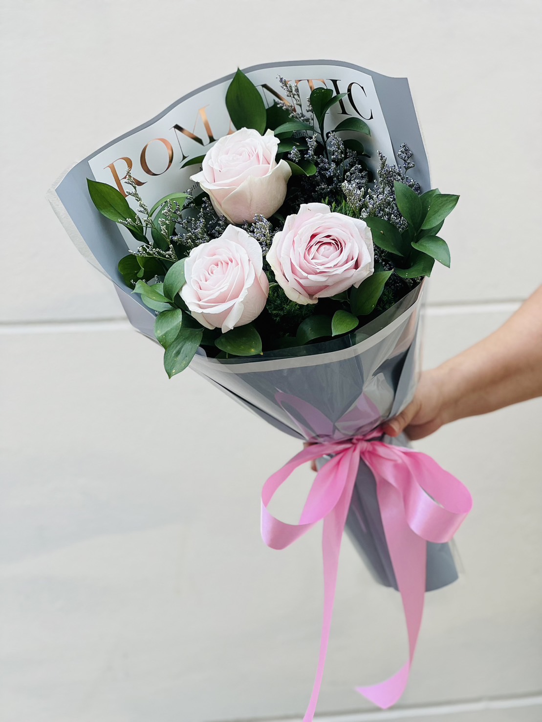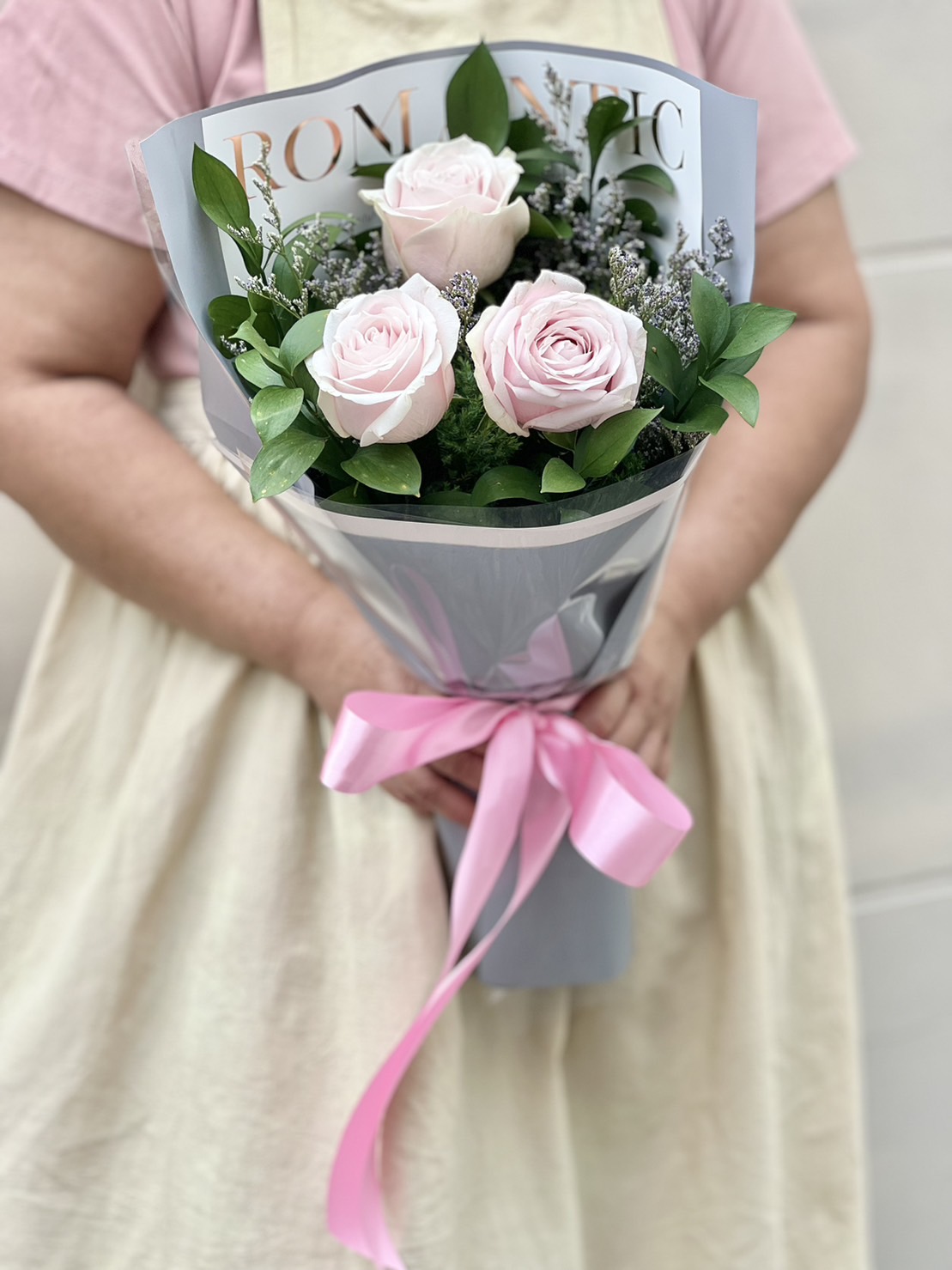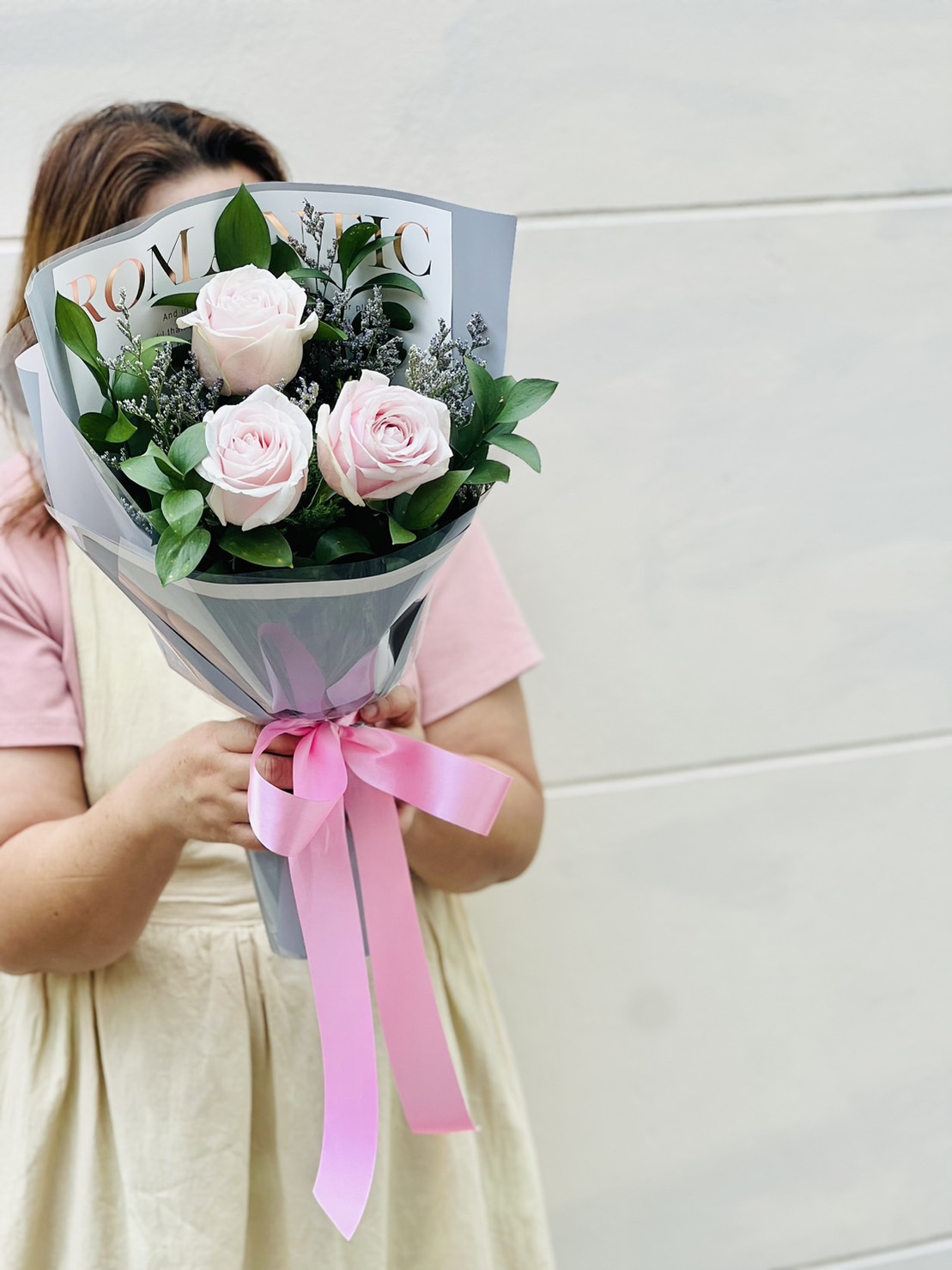 Prepare for valentines day with precious bouquet. A fresh 3 pink roses are arranged in hand tie style. Start a good day with delightful and glamorous flowers. Lets flower speak for you. tag: ดอกไม้วาเลนไทน์, ดอกไม้ Valentine