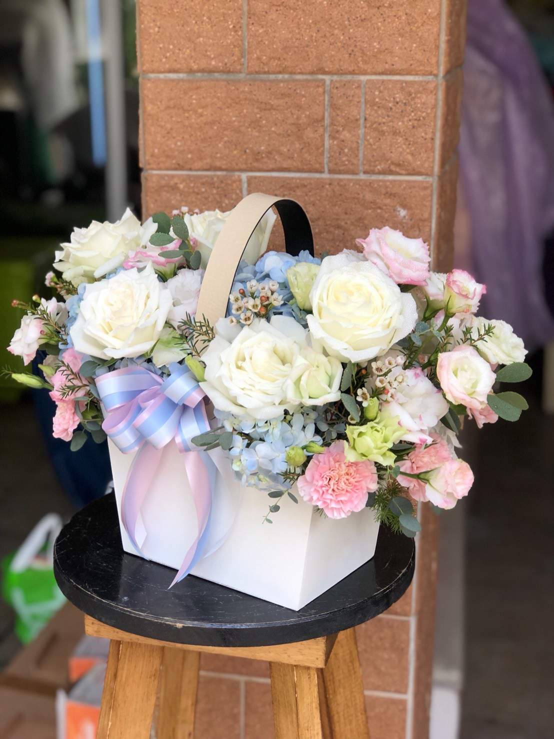 กระเช้าดอกไม้ในรูปแบบสวยหวานละมุนไม่ซ้ำใครดอกไม้ประกอบด้วยกุหลาบขาวนำเข้า ไฮเดรนเยียสีฟ้าสดใส เพิ่มความหวานด้วยไลเซ็นทัสและคาร์เนชั่นสีชมพูหวาน เป็นของขวัญมีค่าส่งมอบแทนความรักให้คุณแม่ทุกท่าน