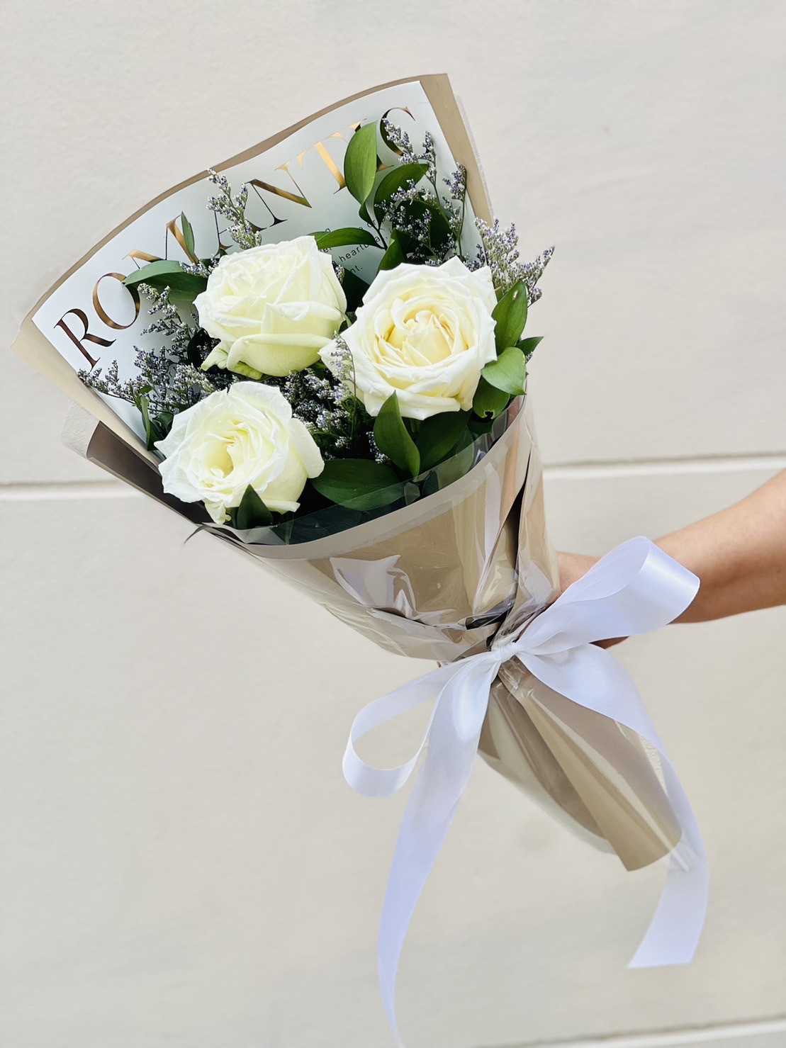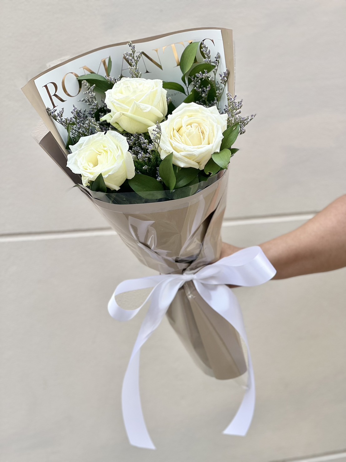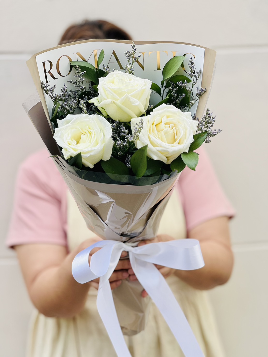 Show your true love with this splendid flower bouquet. This floral arrangement is comprised of 3 white roses. Write down your feelings in the card and surprise that person with your care! tag: ดอกไม้วาเลนไทน์, ดอกไม้ Valentine