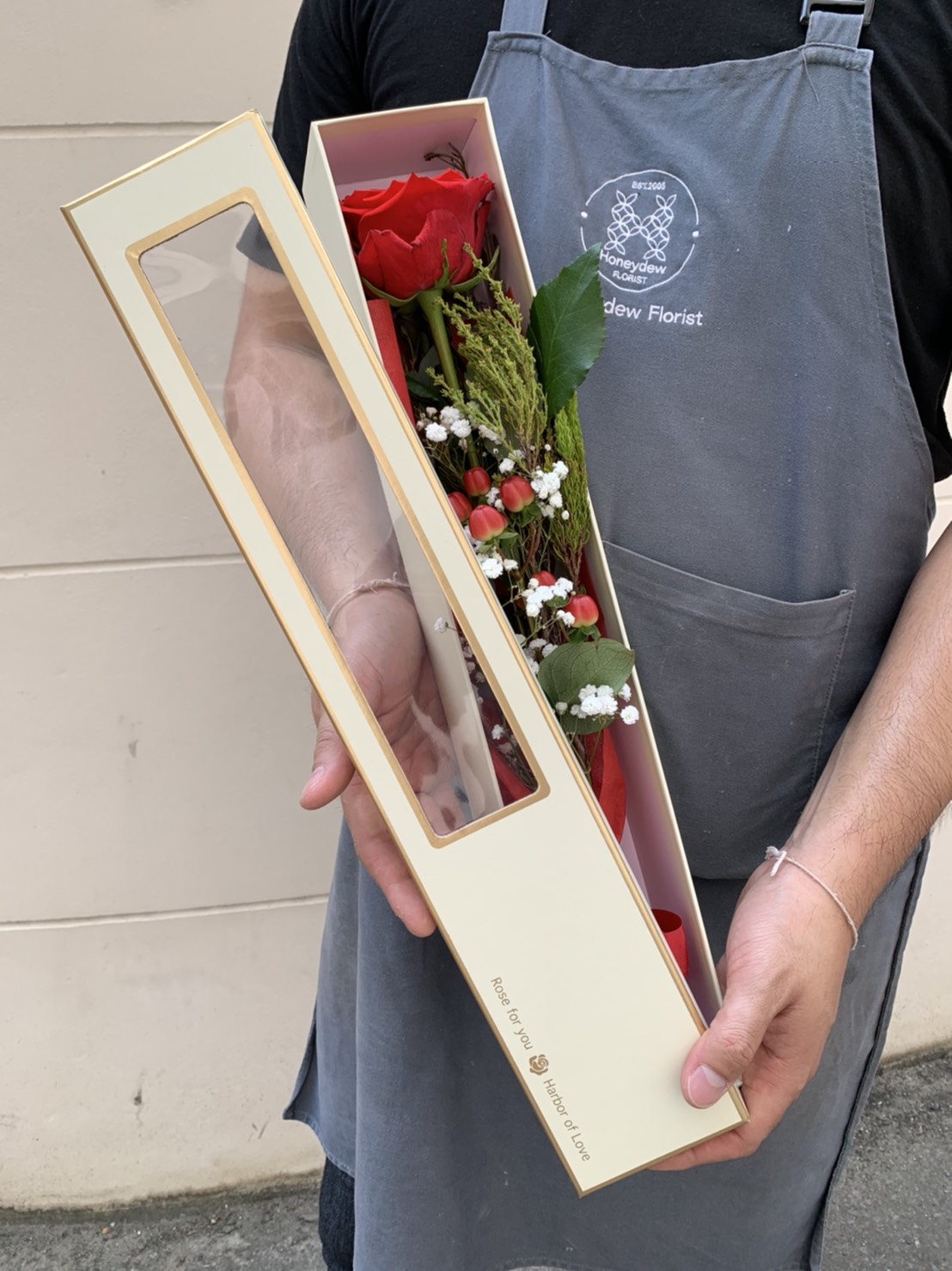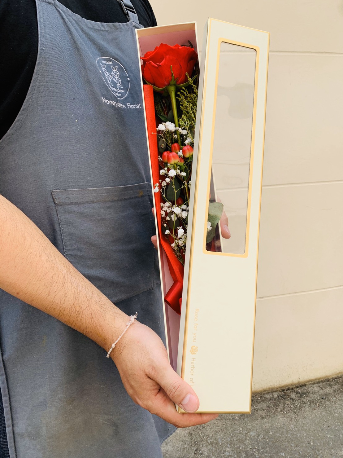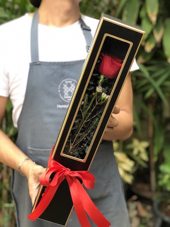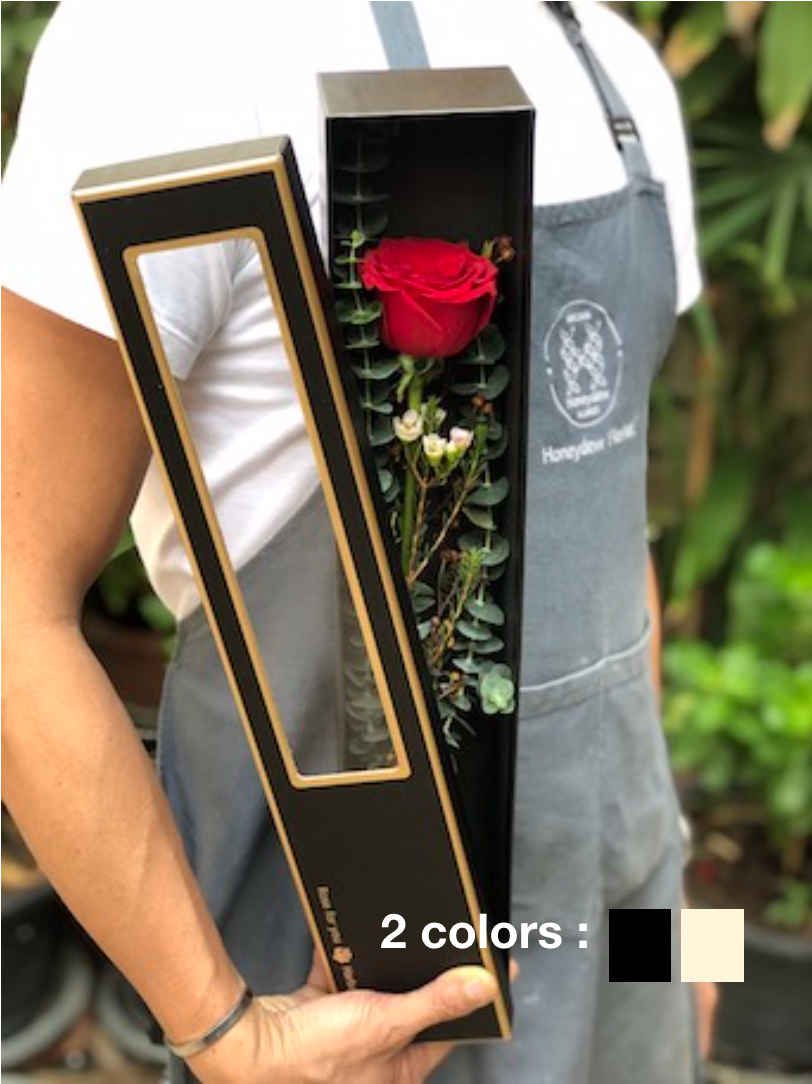This eye-catching bouquet contains a single red rose in luxury box. Send your best wishes through the good meanings of these flowers. Give brightness and youthfulness to your loved ones. (2 choices of color box : Black/Off white)